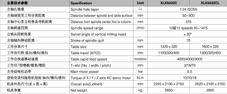 XLK5032CL立式数控升降台铣床参数: